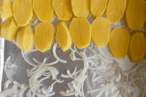 Застелить противень фольгой, слегка смазав подсолнечным маслом. Первым слоем выложить лук, а сверху — картофель.