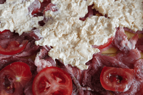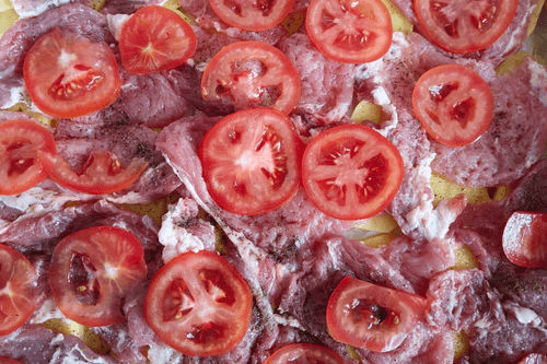 Выложить помидоры на мясо, распределив по 1–2 кружочка на каждый стейк.