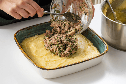 В форму для выпечки выложить половину пюре ровным слоем. На него выложить начинку из печени трески и закрыть второй половиной пюре.