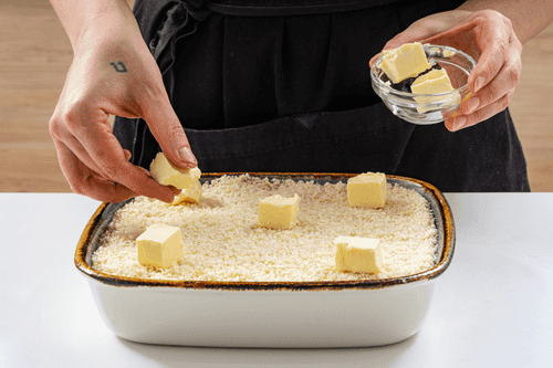Посыпать запеканку сухарями и сверху выложить небольшие кусочки масла. Запекать в духовке 40–45 минут или до золотистой корочки.