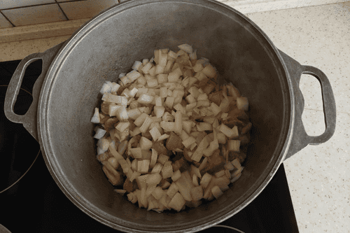 К мясу добавить крупно нарезанный лук. Тушить еще 5 минут.