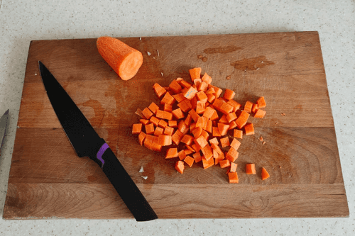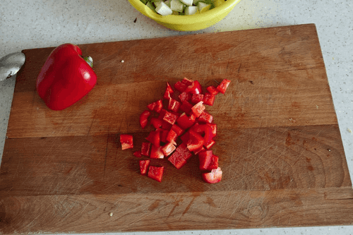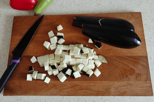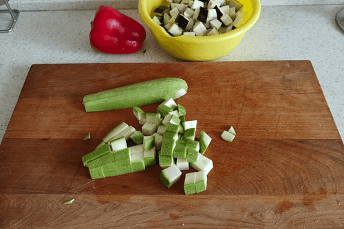 Если кабачок молодой, то нарезать его кубиками, не очищая.