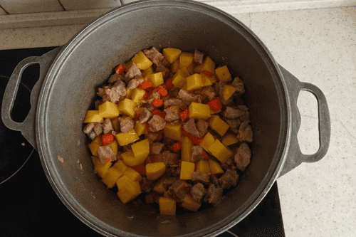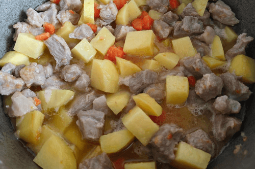 Влить воду, уменьшить огонь и тушить до готовности мяса.