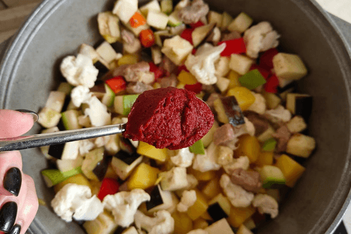 Все овощи сложить в казан, добавить томатную пасту. При необходимости еще добавить воды и тушить 5 минут до готовности всех овощей.