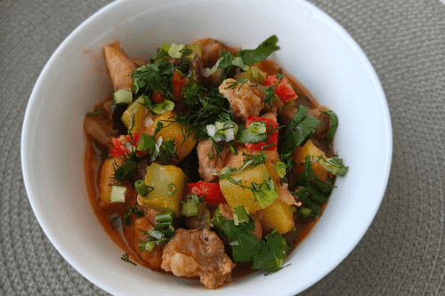 Тушеная свинина с овощами — это традиционное русское блюдо, сочетающее простоту приготовления и насыщенный вкус. Оно уходит корнями в деревенскую кухню, где продукты тушились в казане, позволяя им полностью раскрыть свои ароматы. Нежное мясо свинины становится сочным, пропитываясь вкусом свежих овощей, таких как картофель, морковь, баклажаны и сладкий перец. Специи, чеснок и зелень добавляют глубину вкуса, а томатная паста придает легкую кислинку и насыщенный цвет. Блюдо идеально подходит для уютного семейного ужина, согревая и насыщая. Его можно подавать самостоятельно или с ломтиком свежего хлеба, который отлично впитывает ароматный соус. Вкус тушеной свинины с овощами богатый, теплый и домашний, делая его неизменным фаворитом русской кухни.