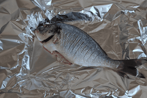 Противень застелить фольгой и выложить рыбу.