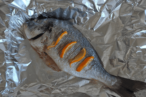 Поперчить и посолить по вкусу сверху, а также внутри дорады.