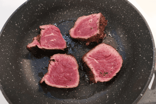 Выложить на разогретую сковороду и обжаривать со всех сторон по 1–2 минуты на сильном огне.