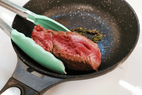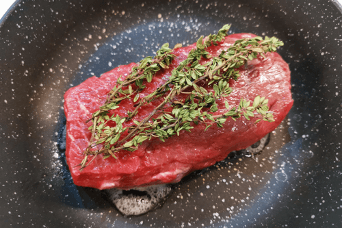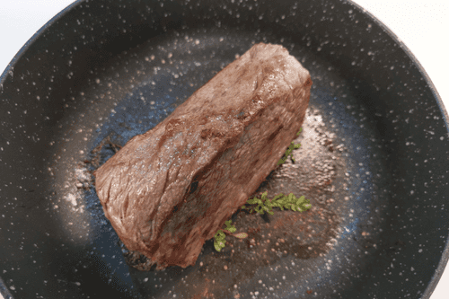 Перевернуть стейк, положить его на веточки тимьяна и обжаривать еще 2 минуты.