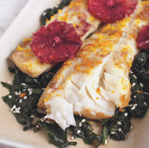 Подавать филе хека на подушке из шпината, украсив кружочками красного апельсина.
