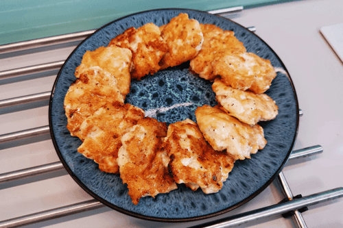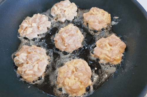 В разогретое на сковороде оливковое масло, порционно выложить ложкой смесь. Обжаривать 3–4 минуты до золотистой корочки.