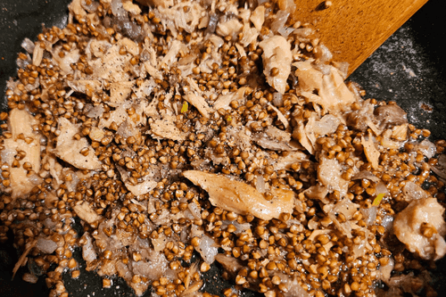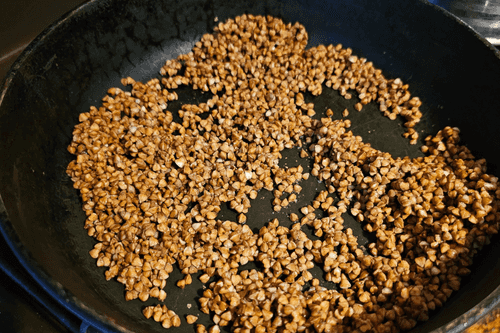 Промытую гречку обжарить на сухой сковороде 3 минуты.