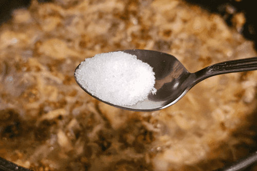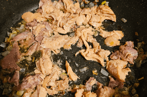Добавить тушенку и немного жира от нее. Мясо разделить на небольшие кусочки и тушить 4–5 минут.