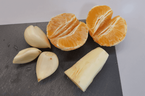 Очистить чеснок, имбирь и мандарин.
