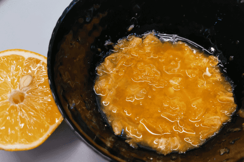 В глубокую миску выжать сок мандарина, мякоть отцеживать не нужно. Затем добавить сок лимона.