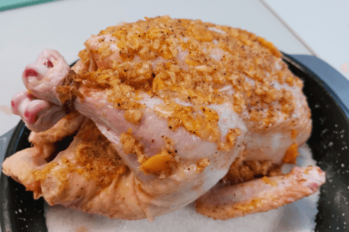 Курицу натереть маринадом и выложить на соль.