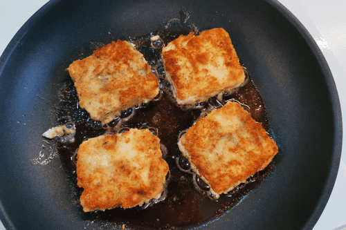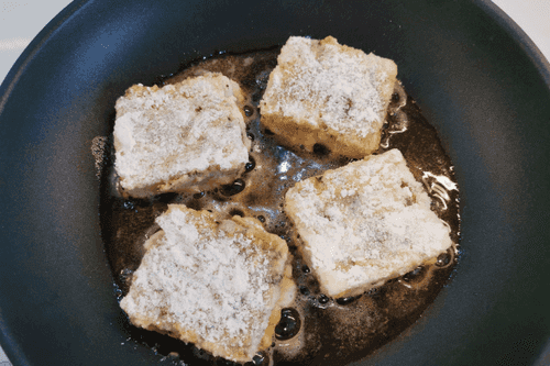 Затем макнуть обеими сторонами в муку и переложить на сковороду с разогретым маслом.