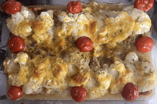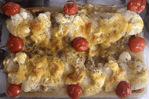 Сыр натереть на терке, посыпать филе и выложить сверху коктейльные томаты.