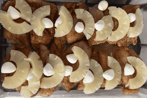 Куриное филе, запеченное с ананасами и коктейльными томатами