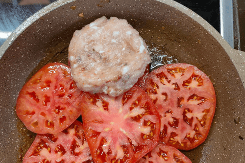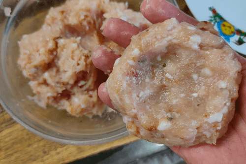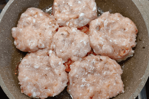 Из фарша сделать шарики и затем, приплюснув их, сделать гнездо, вдавив фарш посередине.