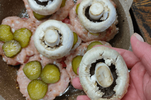 Затем положить шампиньоны (вниз шляпкой, вверх ножкой).
