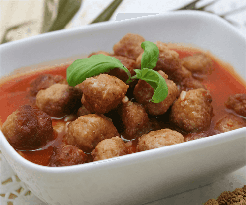 Из фарша скатать шарики размером с грецкий орех. Обвалять их в муке так, чтобы они были покрыты тонким слоем. В глубокой сковороде разогреть оливковое (или подсолнечное) масло, бросить туда фрикадельки и жарить около 5 минут, часто переворачивая, на сильном огне. Затем переложить фрикадельки в блюдо для запекания и залить соусом. Поместить блюдо в предварительно разогретую до 180 градусов духовку на 15 минут.