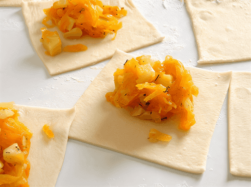 Из муки, соли и воды замесить эластичное тесто. Тонко раскатать и нарезать на квадраты 10х10 см.
