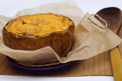 У небольшой тыквы срезать верхушку, вынуть ложкой зерна, затем часть мякоти до толщины стенок тыквы в 1–1,5 см.