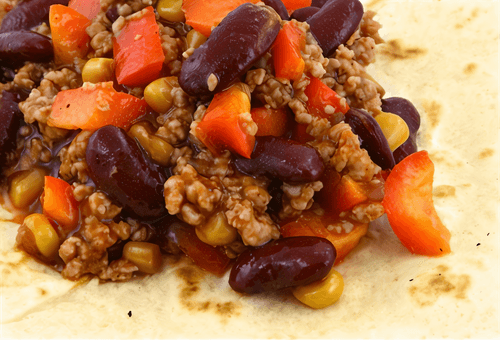 Добавить к фаршу мелко нарезанный лук, измельченный чеснок, кубики зеленого или красного сладкого перца, чили, красные бобы, кукурузу и продолжать томить.