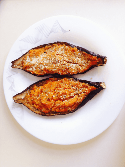 Вынуть баклажаны из духовки, но не выключать ее. Дать им остыть немного, потом аккуратно извлечь мякоть чайной ложкой, стараясь не повредить шкуру. Удалить семена, нарезать мякоть.