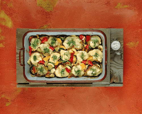 Получившуюся смесь посолите и поперчите по вкусу. Выложите кабачки в форму для запекания, залейте их овощной смесью и потомите в духовке еще 15–20 минут. Готовое блюдо охладите и подавайте, посыпав рубленой зеленью.