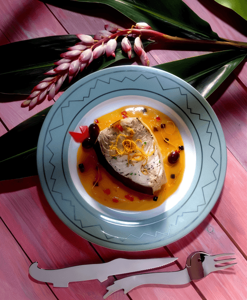 Рыба-меч с луком и белым вином