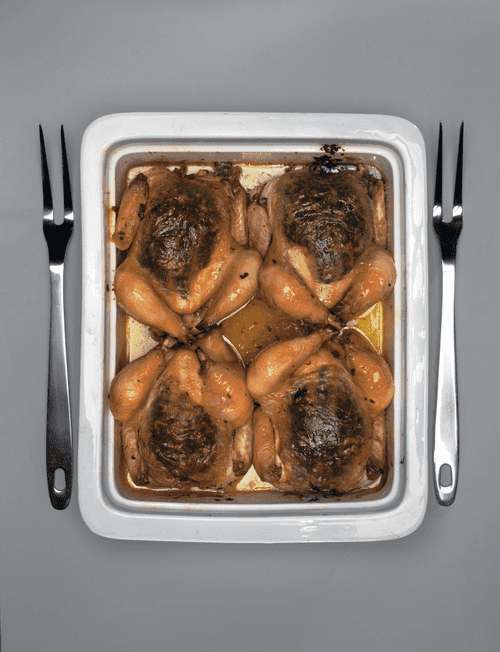 У цыплят вырезать хребты: большим острым ножом два разящих удара или аккуратные пилообразные движения — и у вас в руках цыплячьи позвоночники, которые потом можно пустить на бульон.