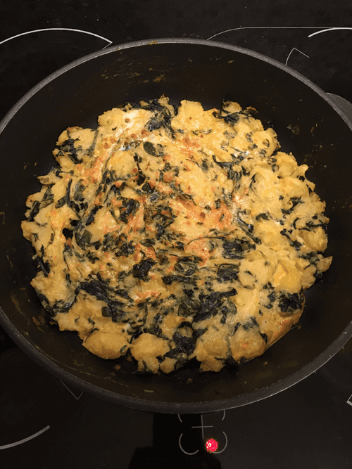 Как только чеснок начнет благоухать, нужно бросить в сковороду листья шпината и, помешивая, добиться того, чтобы они сникли, как будто вся жизненная сила ушла из зелени в соус. Тогда нужно посолить и поперчить содержимое сковородки. И смешать его с картошкой и сметаной при помощи большой вилки.