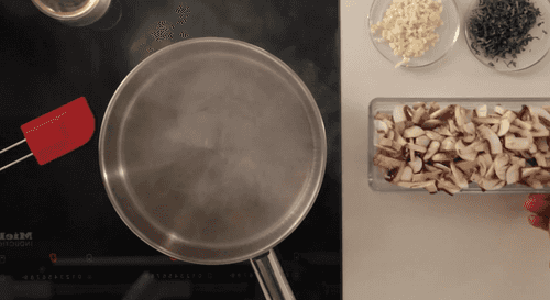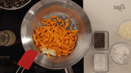 В глубоком сотейнике растопить сливочное масло и обжарить на нем мелко нарезанную мякоть тыквы, посолить, поперчить и жарить еще пять минут, постоянно помешивая. Потом влить бульон, перемешать и варить еще десять минут, после чего добавить сметану, тертый пармезан (25 г), грибы с чесноком, перемешать, сделать огонь минимальным и варить еще десять минут, время от времени, помешивая.