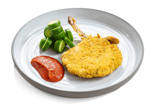 Подавать свинину по-милански с маринованными огурцами и домашним кетчупом.