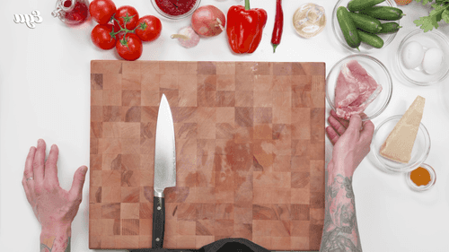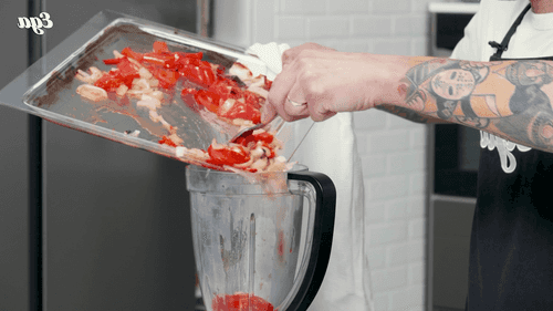 Переложить запеченные овощи в блендер, добавить халапеньо (по желанию), томатную пасту, красный винный уксус.