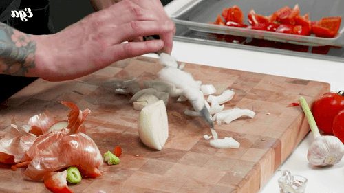 Для соуса произвольно нарезать сладкий перец, лук и помидоры.