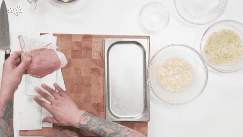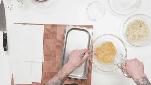 Обвалять мясо в муке, затем в яйцах и панировочной смеси.