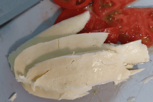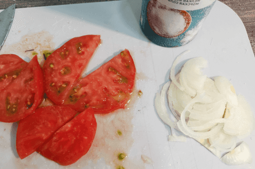 Нарезать лук и помидор полукольцами. Помидор посолить.