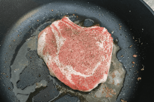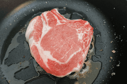 В разогретое на сковороде масло выложить корейку. Обжаривать на сильном огне 3–4 минуты.