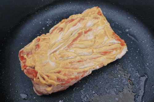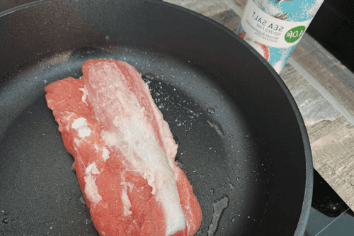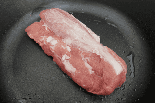 Разогреть на сковороде масло и выложить вырезку. Обжаривать 3–4 минуты на сильном огне.