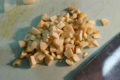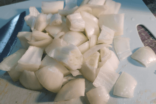 Добавить сушеный лук, перемешать и тушить 5 минут.