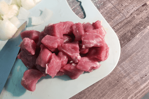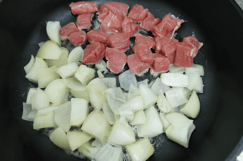 В разогретое масло выложить мясо и лук. Поставить на средний огонь. Обжаривать 3–4 минуты.