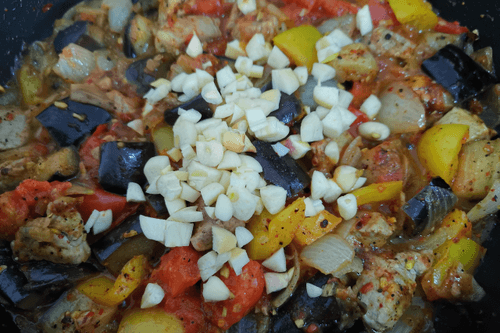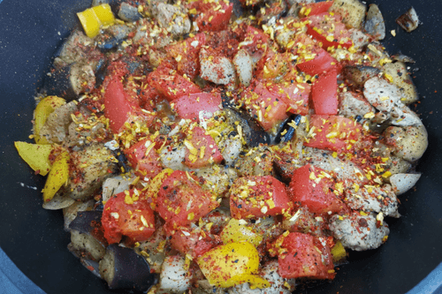 Добавить специи для мяса. Перемешать и тушить около 5 минут.