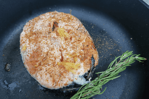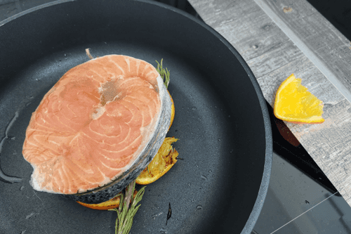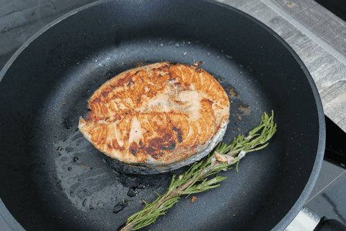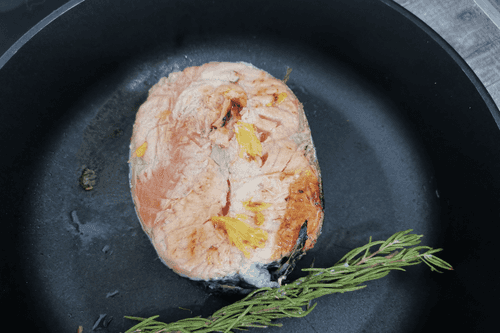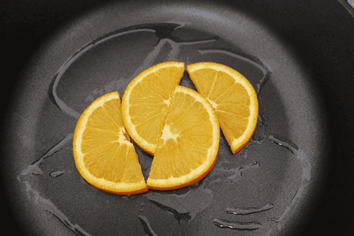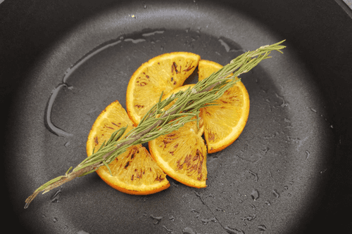 Убрать кусочки апельсина и перевернуть стейк. Розмарин оставить рядом.