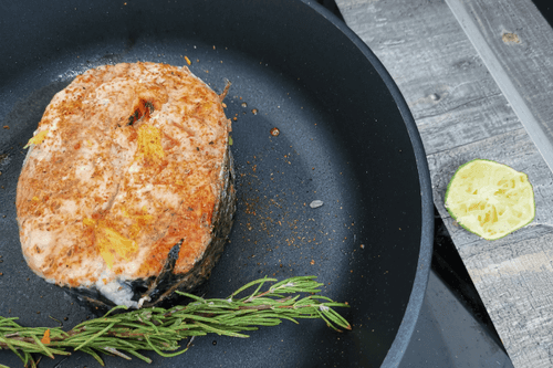 Выложить сверху стейк. Обжаривать 3–4 минуты.
