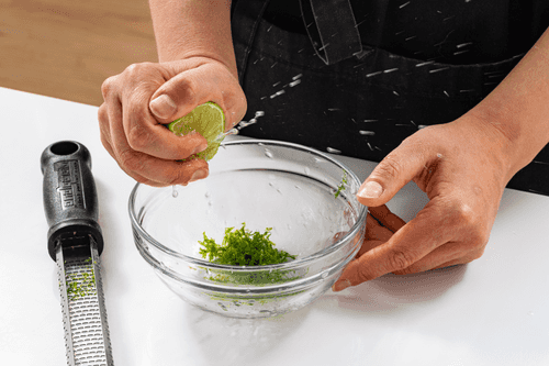 Снять цедру с лайма и выжать из него сок.
