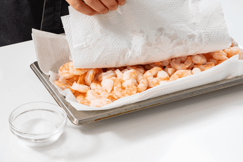 Креветки обсушить бумажными полотенцами, посолить.