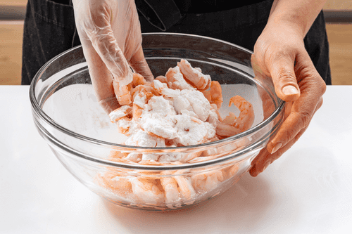 Высыпать в миску кукурузный крахмал и обвалять в нем креветки.